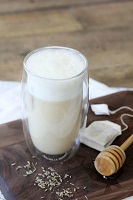 - Add the tea, honey and almond milk (heat the almond milk if you are planning to make it hot) into a blender and blend on high for 10 seconds.